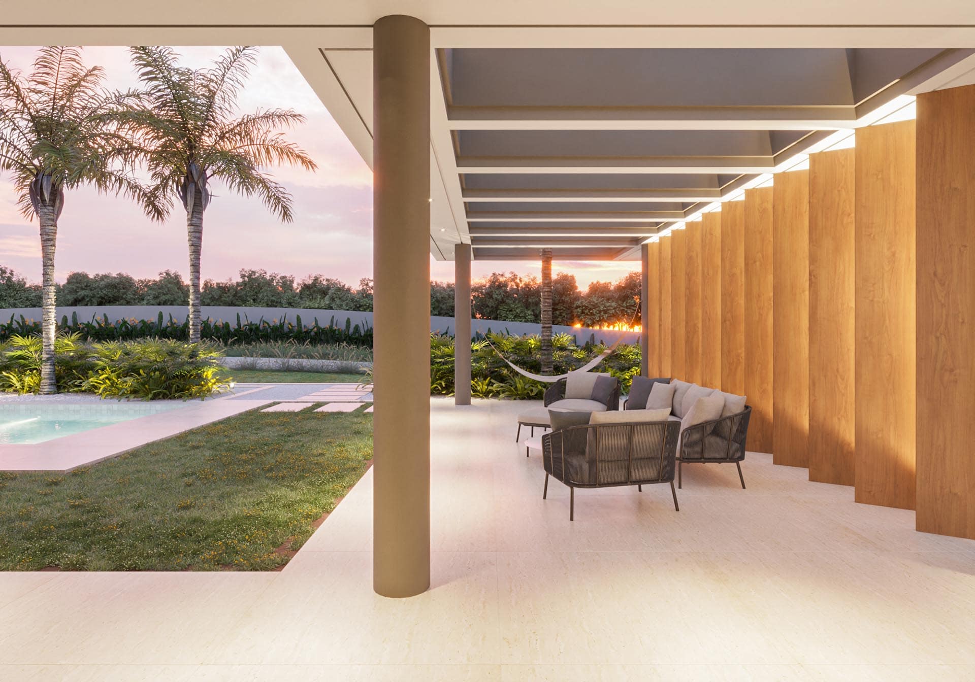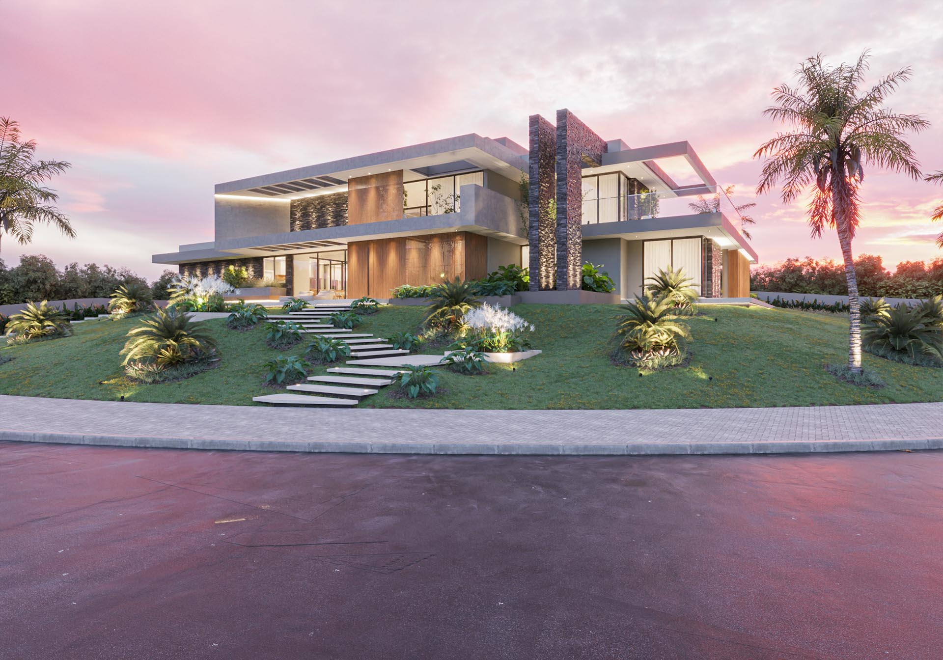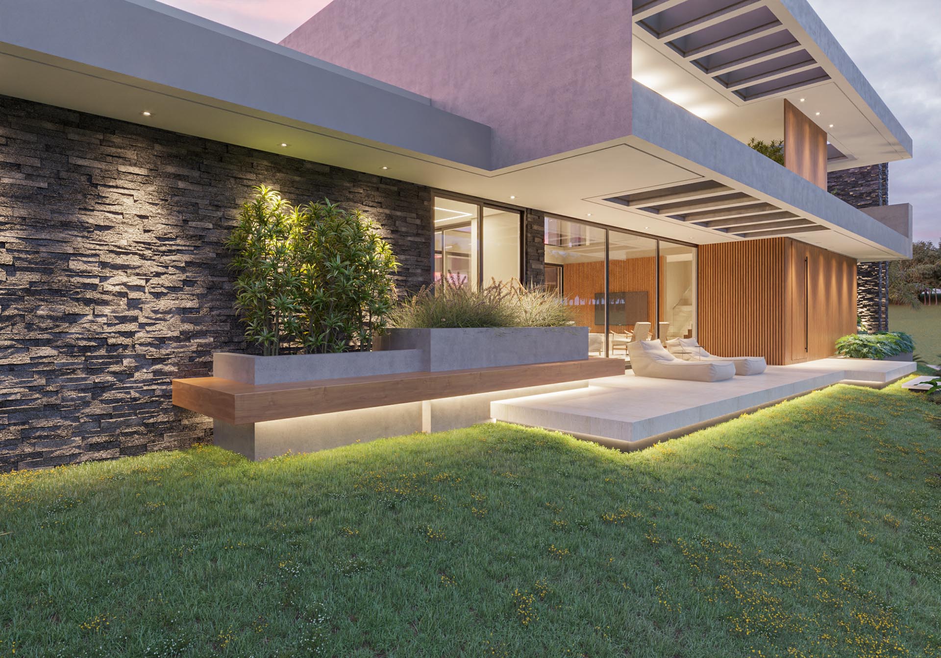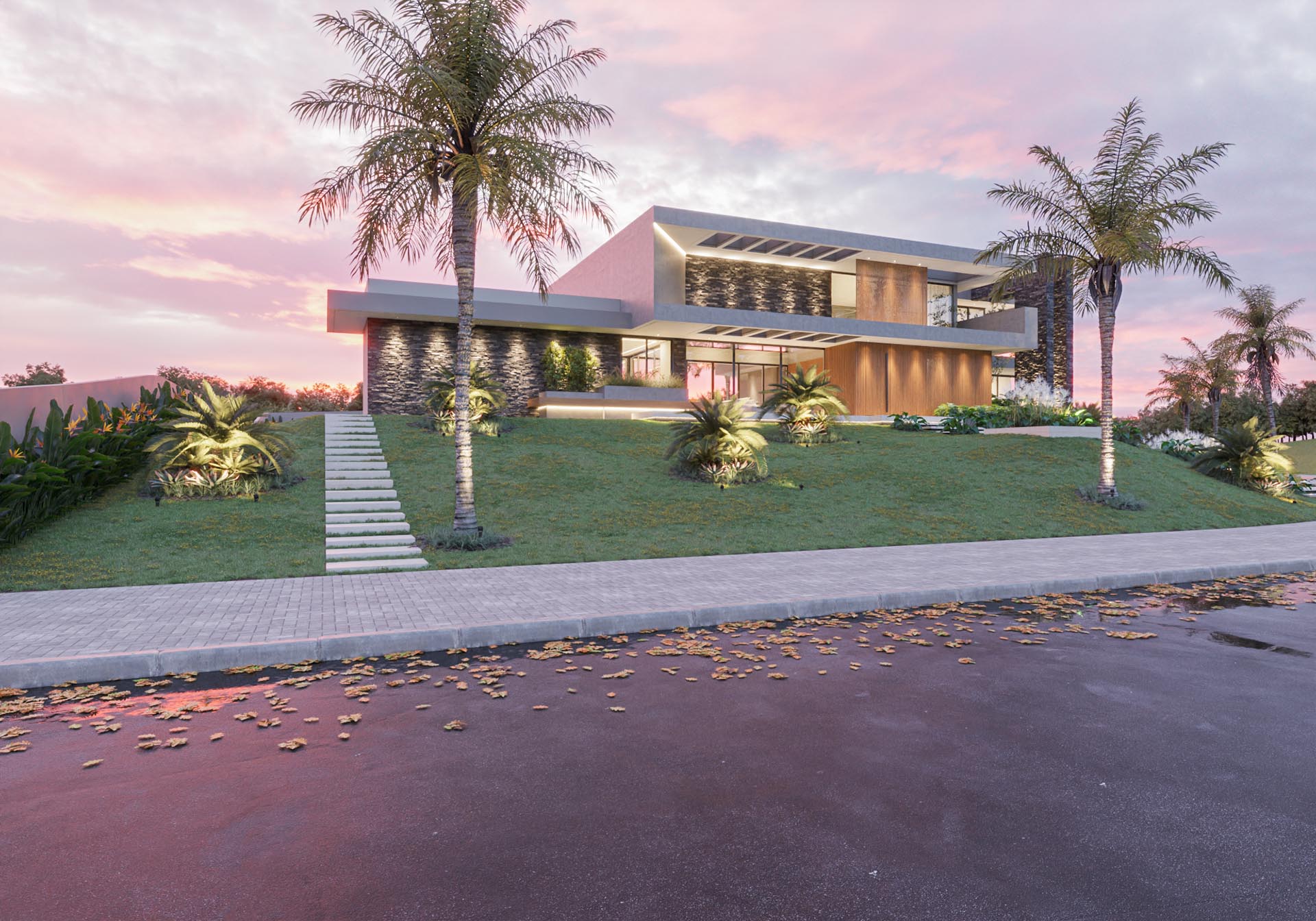 Com poucos ambientes na parte superior, o projeto basicamente de um único pavimento, dispõe de uma área social que foi totalmente integrada. Resultando em uma cozinha gourmet e lounge que abraçam toda área da piscina com cascata, ideal para os momentos de confraternização.