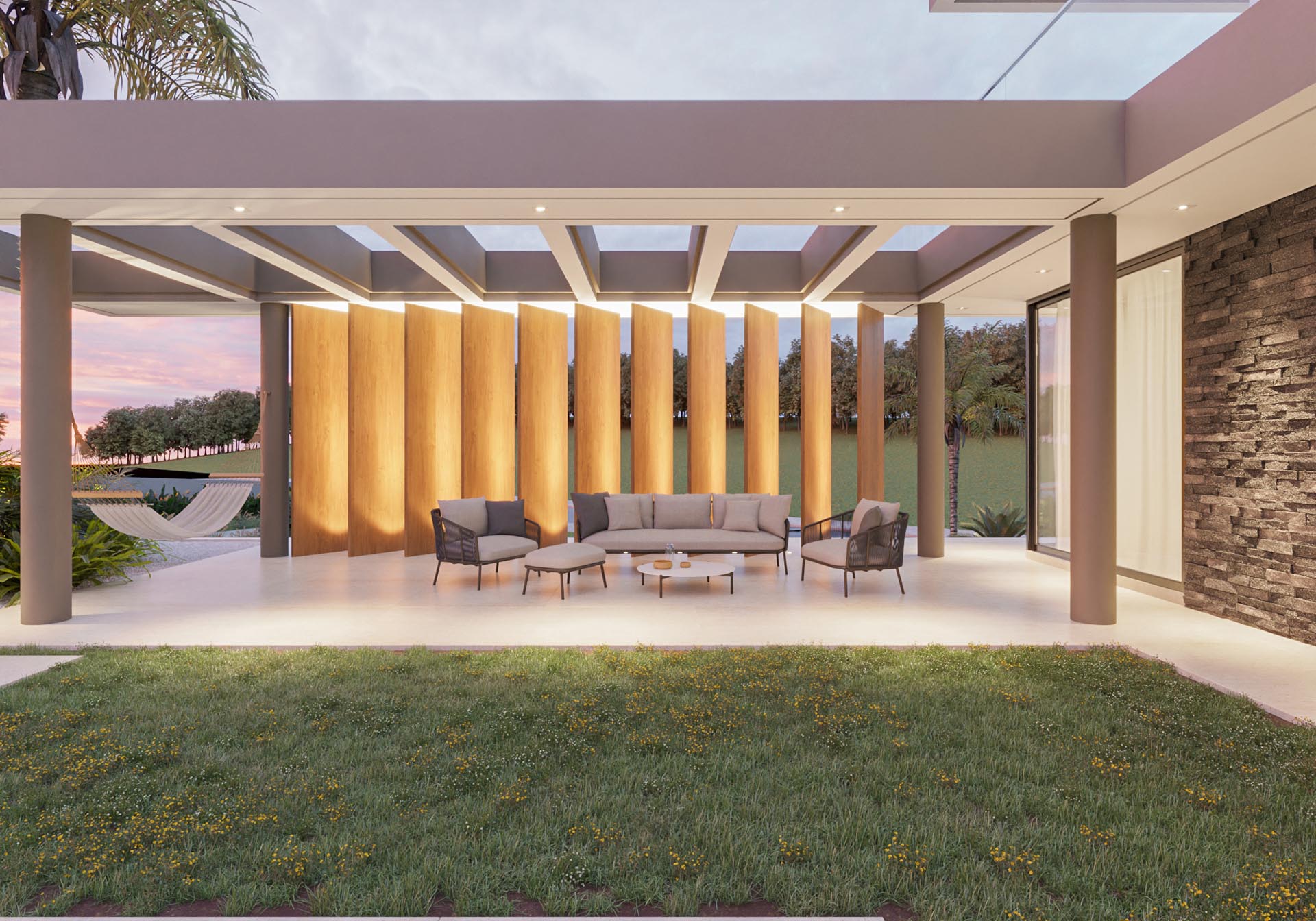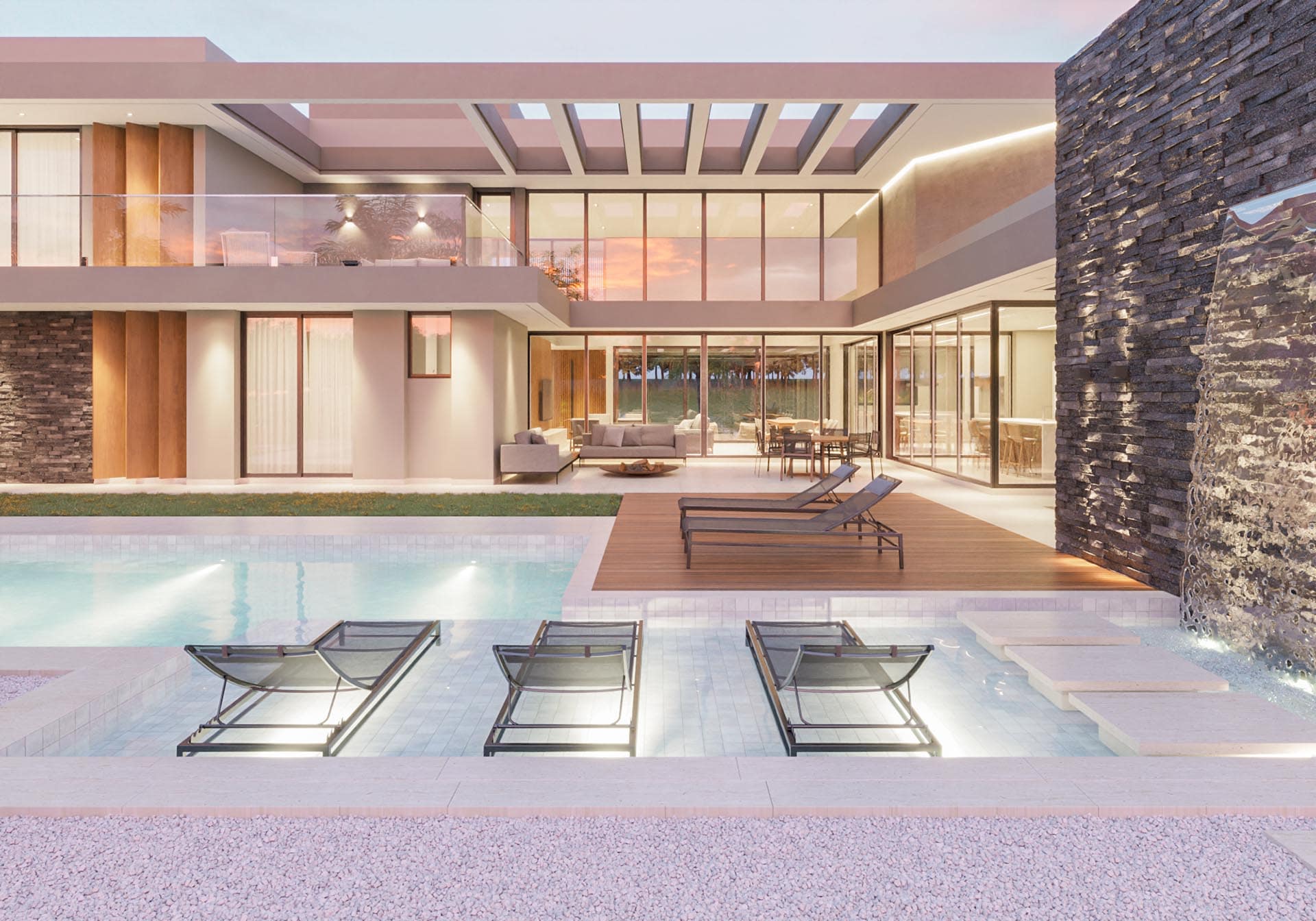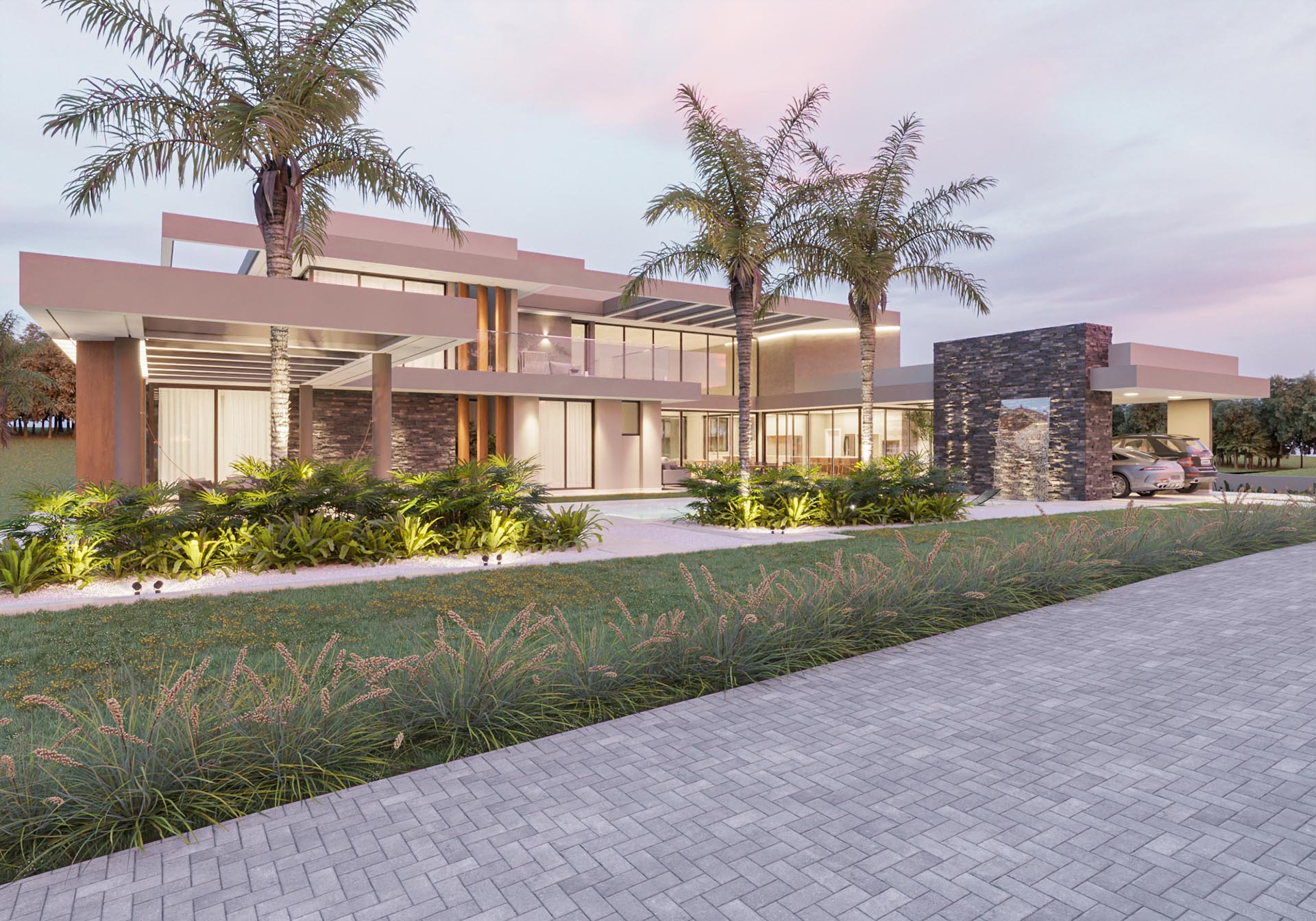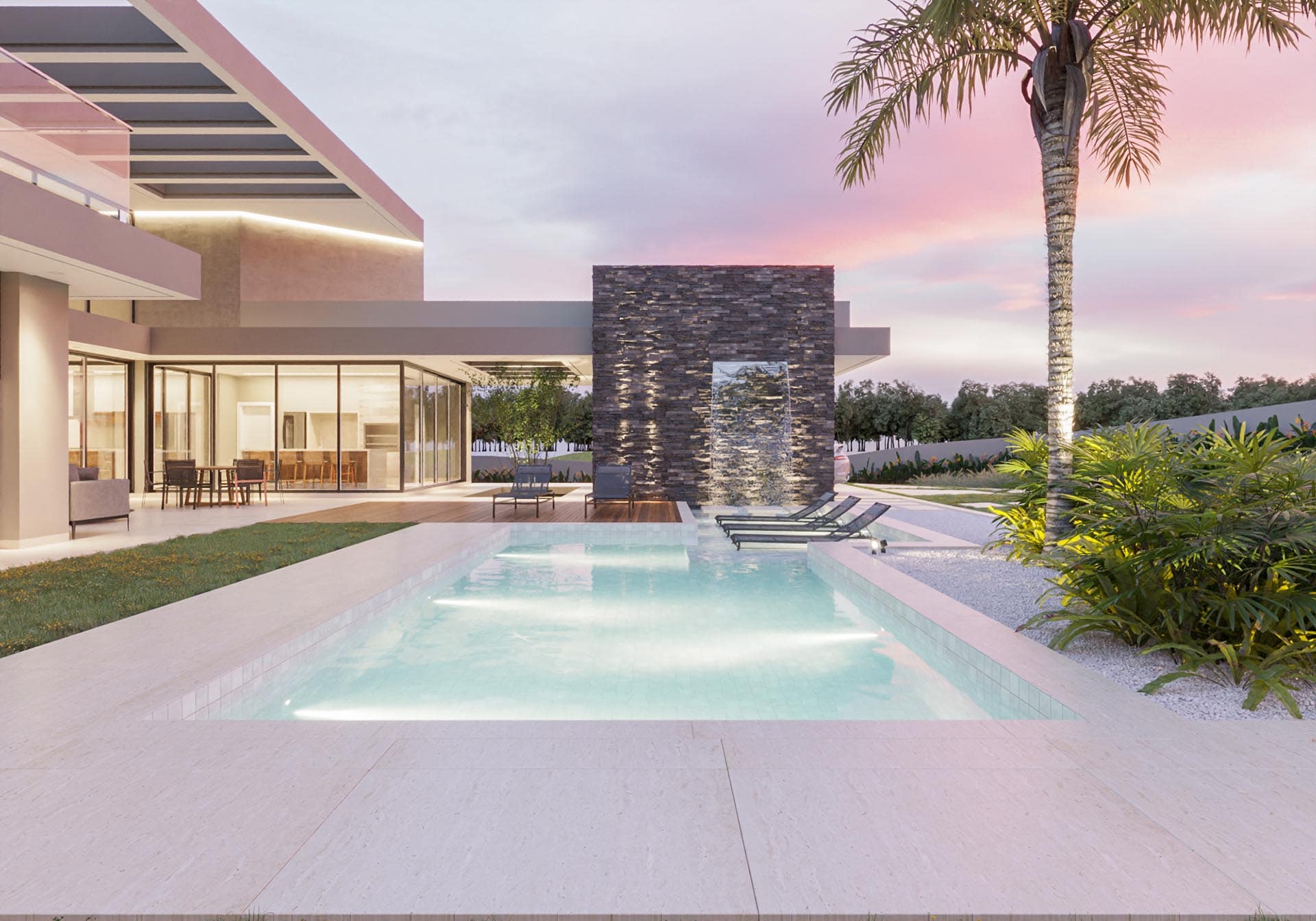 Com poucos ambientes na parte superior, o projeto basicamente de um único pavimento, dispõe de uma área social que foi totalmente integrada. Resultando em uma cozinha gourmet e lounge que abraçam toda área da piscina com cascata, ideal para os momentos de confraternização.