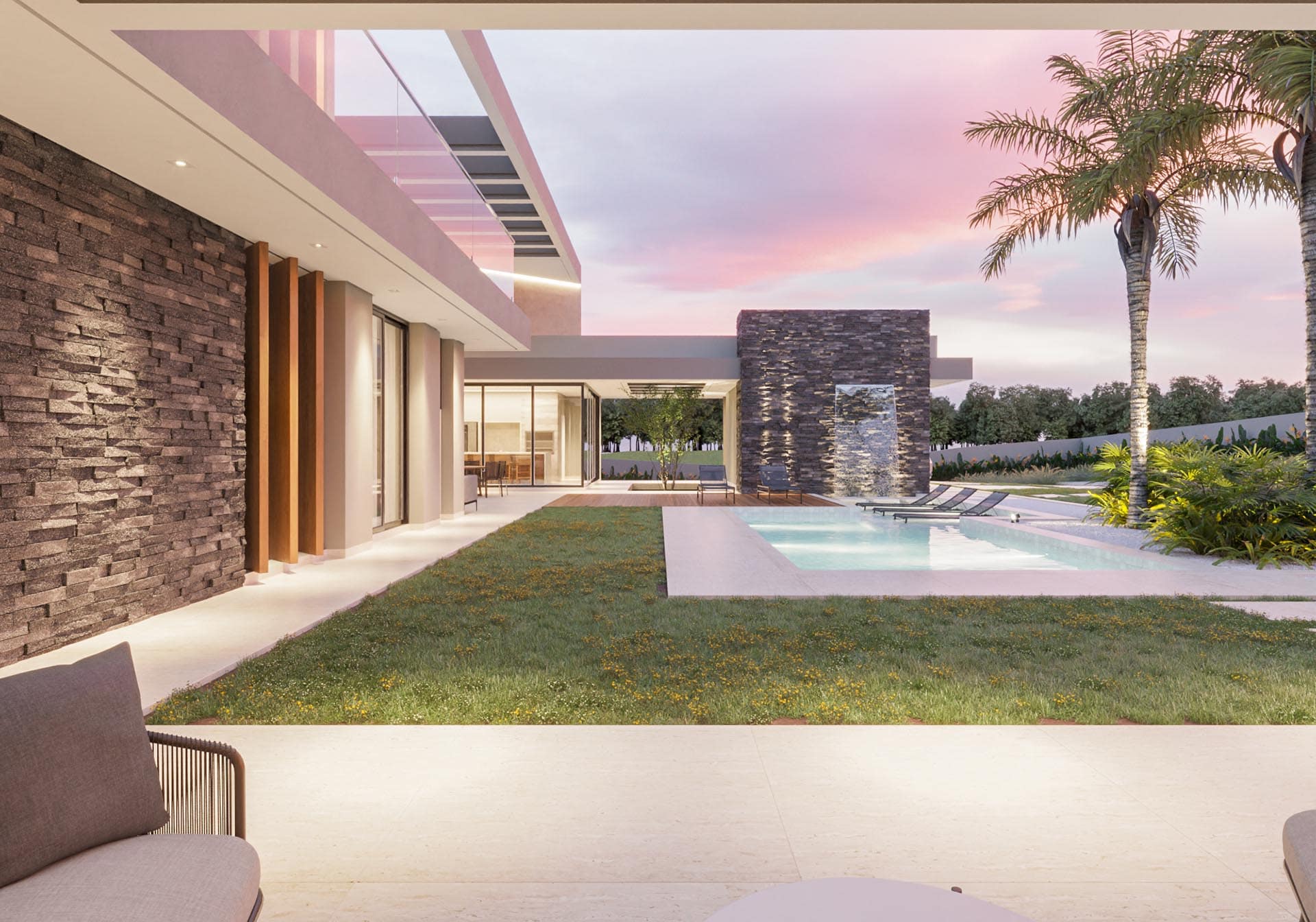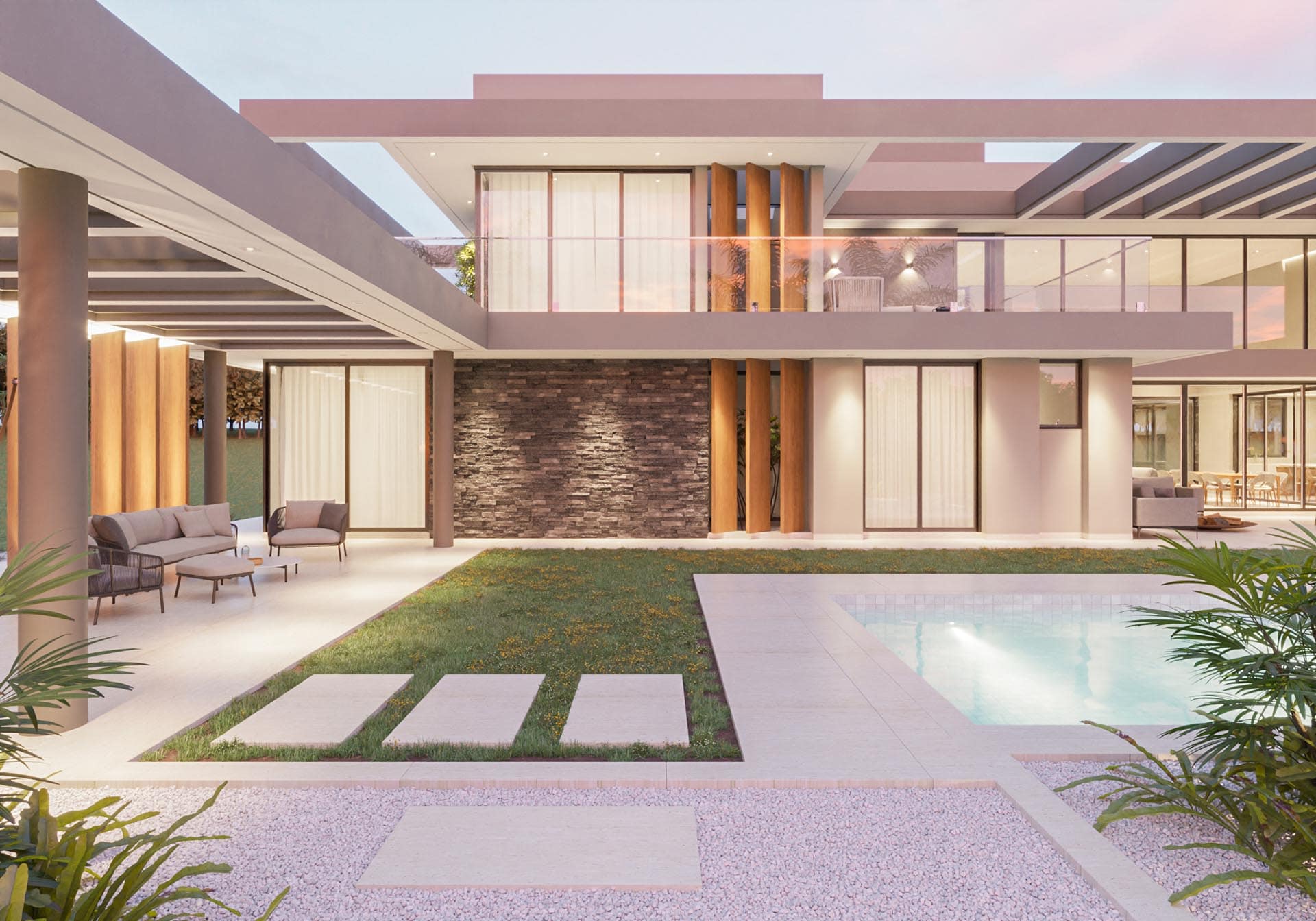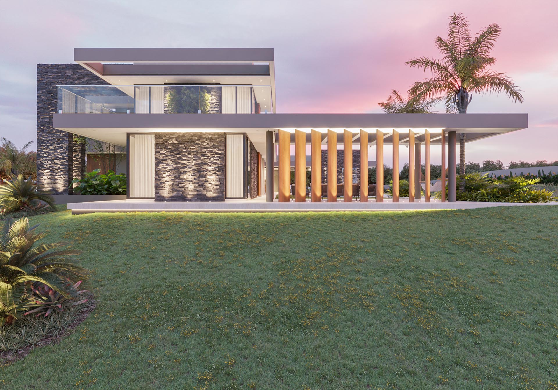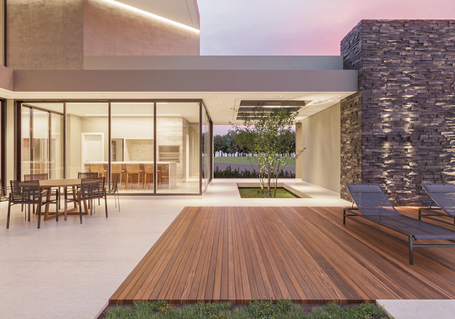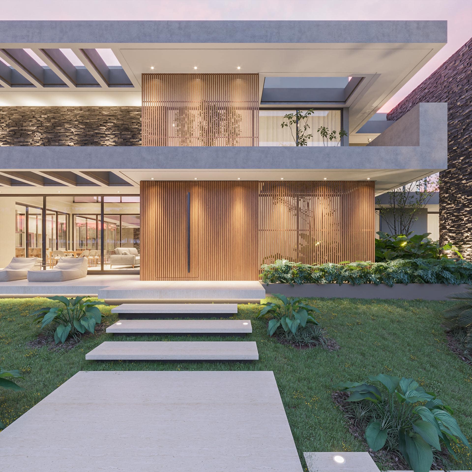 A arquitetura da residência F.E. com paleta de cores modernas, forte presença de madeira e revestimentos em pedras reúne aconchego, sofisticação e praticidade para a família.