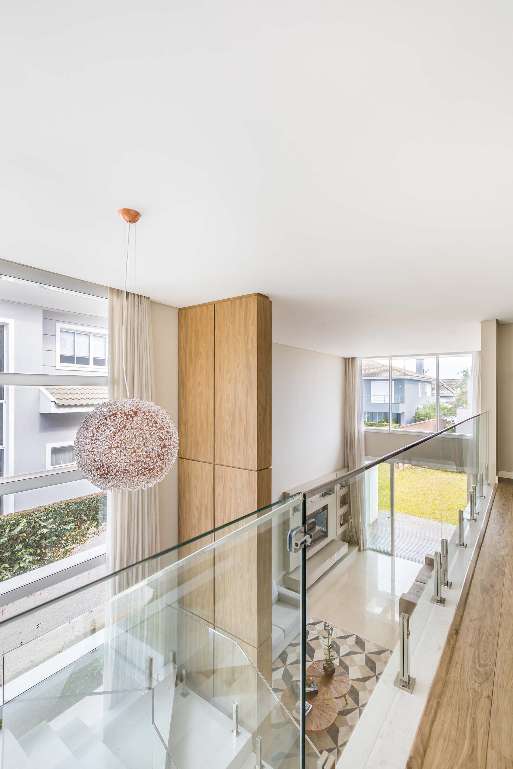 Perfeitamente adequada a topografia do terreno, a casa desfruta de um pé direito duplo amplo, suíte máster privilegiada em relação a iluminação solar e área da cozinha gourmet integrada a área de serviço. O dormitório no pavimento térreo reversível para ambiente de escritório ou para receber algum hóspede.